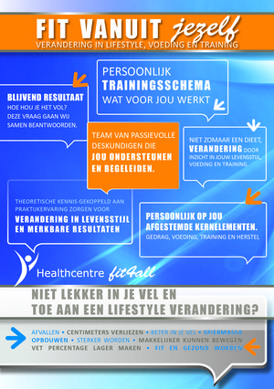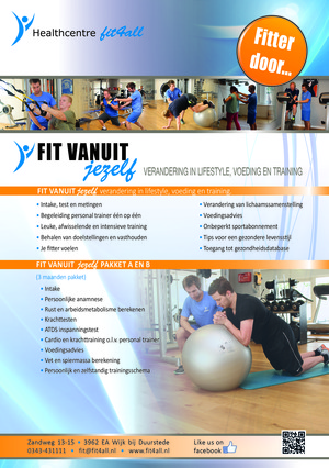 Wat is Fit vanuit jezelf?Fit vanuit jezelf is een persoonlijk programma om fitter en gezonder door het leven te gaan. Onder begeleiding van een lifestyle coach en personal trainer wordt je iedere week begeleidt om aan jouw persoonlijke doelen te werken. Samen met je coach wordt er een op maat gemaakt plan opgesteld gebaseerd op 4 kernelementen: • Gedrag • Training • Voeding • Herstel Tijdens de uitvoering van jouw programma krijg je iedere week ondersteuning van je coach. Fit vanuit jezelf biedt je het steuntje in de rug dat je nodig hebt om stap voor stap jouw gewenste resultaat te behalen en te behouden. Er zijn twee verschillende pakketten. Er kan gekozen worden voor 1 keer per week begeleiding of 2 keer per week begeleiding. Je hebt binnen Fit4all een team van meerdere deskundigen tot je beschikking. Hoe lang duurt het?Het startprogramma duurt 3 maanden. In de plaats van dat we de focus puur en alleen op het afvallen richten, willen we met Fit vanuit jezelf zorgen dat je een andere levensstijl ontwikkeld zodat je blijvend resultaat behoud.Na 3 maanden bespreken we de resultaten en wordt er gekeken of je klaar bent voor het nazorgtraject. In het nazorgtraject wordt je steeds een stapje vrijer gelaten en krijg je zelf meer verantwoordelijkheid. Hoe werkt het?De eerste week bestaat voornamelijk uit testen en meten. Er is nu ook een Fitvanuit jezelf groepsles. Een afwisselende training met allemaal mensen die het Fitvanuit jezelf programma volgen of gevolgd hebben.